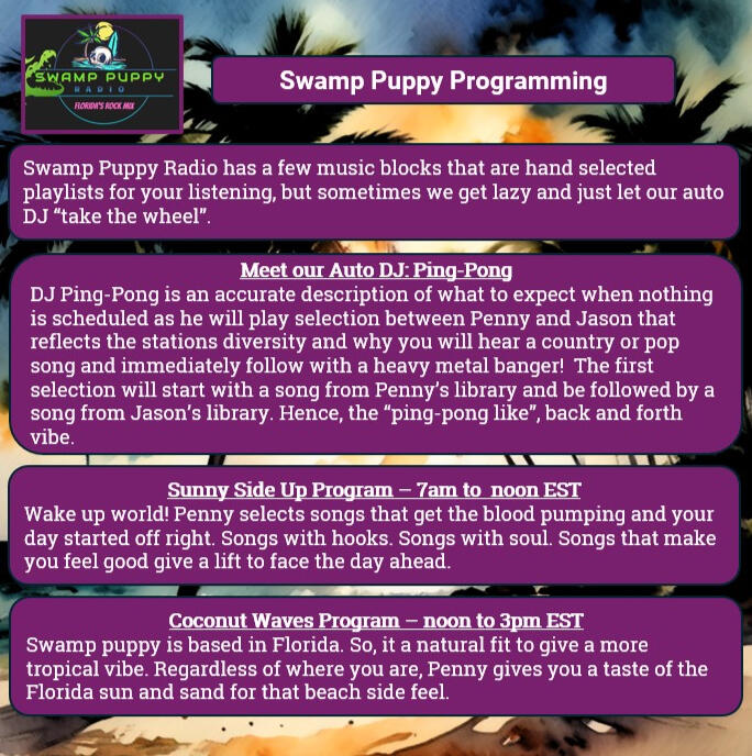 What the hell is Swamp Puppy Radio?Let’s start by explaining what Swamp Puppy Radio is not - A big corporate run internet radio station that plays the same old, music industry sponsored music.The station is owned and operated by two people, Jason and Penny. Between the two of us our taste in music is very diverse and can cover a wide spectrum of music.Jason brings Hard Rock sensibilities that explore more than just the “hits”. Deep tracks are always in the mix and it can come from any decade - from the 60’s to Rock and Heavy Metal of today. Jason is also obsessed with guitar and this colors his song choices to flex into electric blues, classic rock and guitar instrumental compositions. The harder it rocks, the better it is….at least that’s what Jason plays.Penny brings a different flavor and often gravitates to songs that invoke an emotional response, a happy carefree song, a song that can bring a tear to you eye, make you love harder or express the hopeless or healing in a love lost. Country, rock, pop, forgotten classic, reggae, and everything in-between. If it makes you feel something, it’s probably in her playlist.So, what is Swamp Puppy Radio? A celebration of music we like, with no limits, no “standard format”, just a passionate push and pull of two people’s polarizing musical tastes.If you are ready to take a ride on a musical roller coaster and surrender control for something that you can’t find anywhere else. Where you may find something new or be reminded of the music “corporate radio” abandoned and forgot…Welcome to Swamp Puppy Radio!